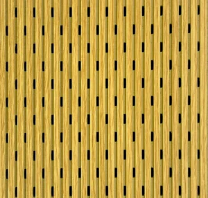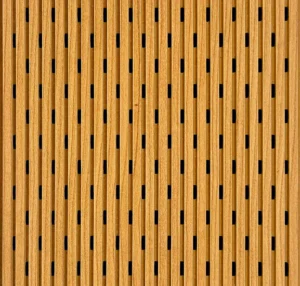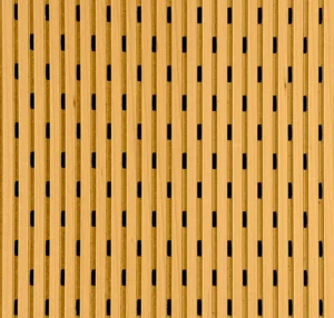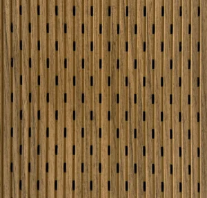 The grooved veneer surface, perforated core material, and black fiberglass mat at the rear combine to create a substantial acoustic performance of up to NRC of 0.95 enhanced by introducing an extra layer of sound absorptive fiberglass as a substrate material.